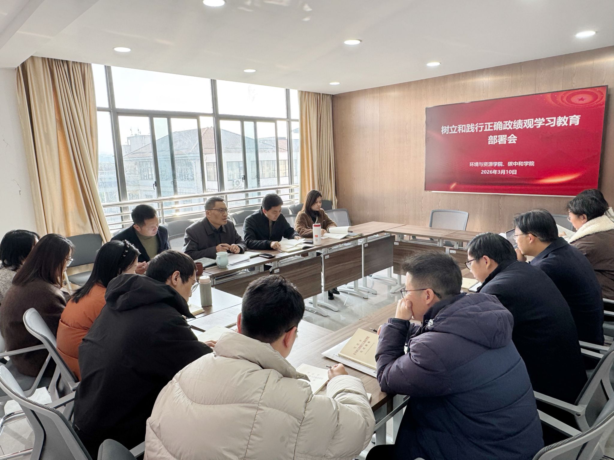 3月10日,环资院、碳中和学院召开党委理论学习中心组扩大会议,深入学习贯彻习近平总书记关于树立和践行正确政绩观学习教育的重要讲话和重要指示精神,传达学习学校党的建设工作领导小组会议精神,部署启动学院树立和践行正确政绩观学习教育工作。学院党委书记侯锡铭主持会议。