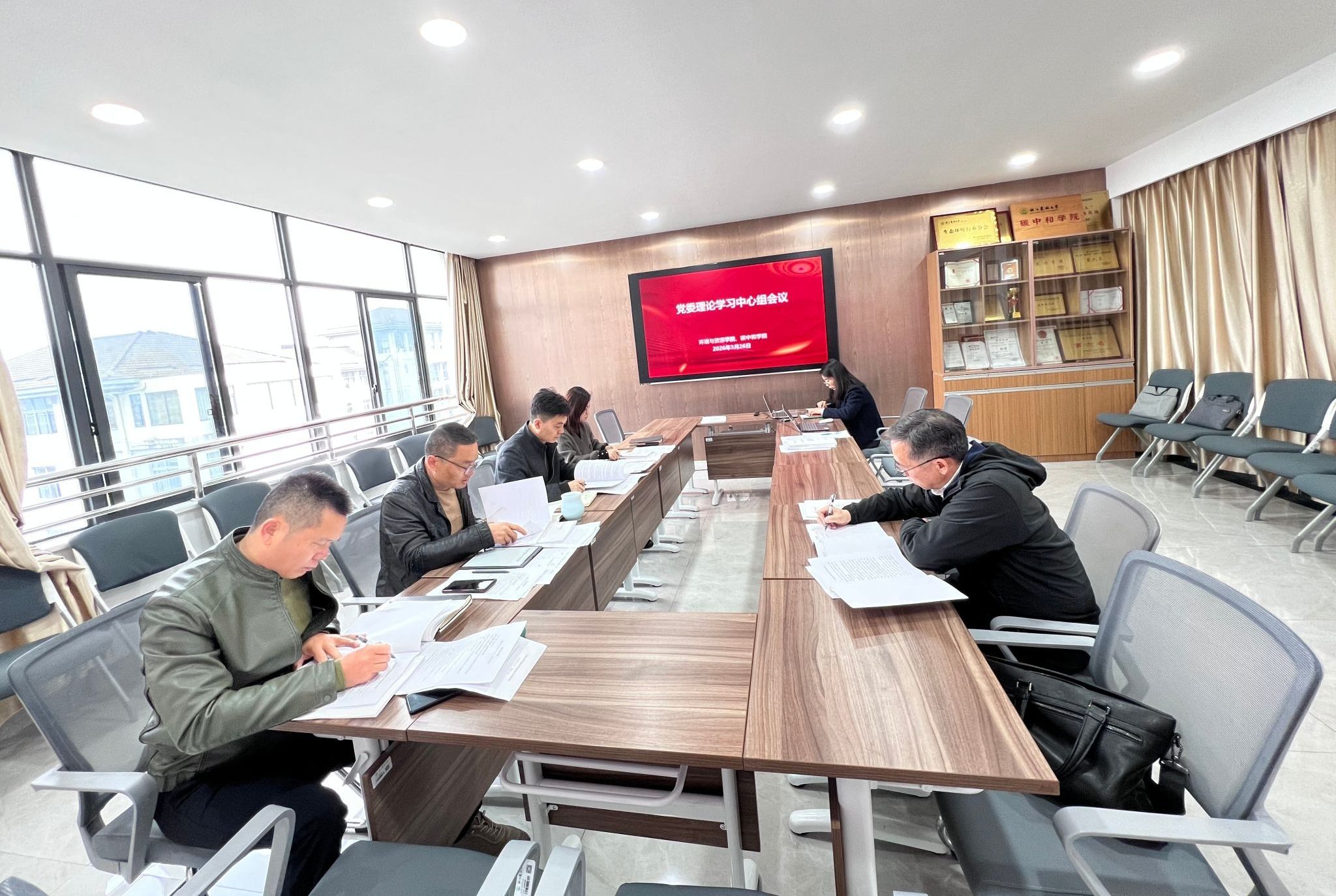 3月26日,环资院、碳中和学院召开党委理论学习中心组会议,深入学习贯彻习近平总书记关于树立和践行正确政绩观的重要论述,专题学习2026年全国两会精神、《中国共产党思想政治工作条例》及“与时俱进的浙江精神”。学院党委书记侯锡铭主持会议。